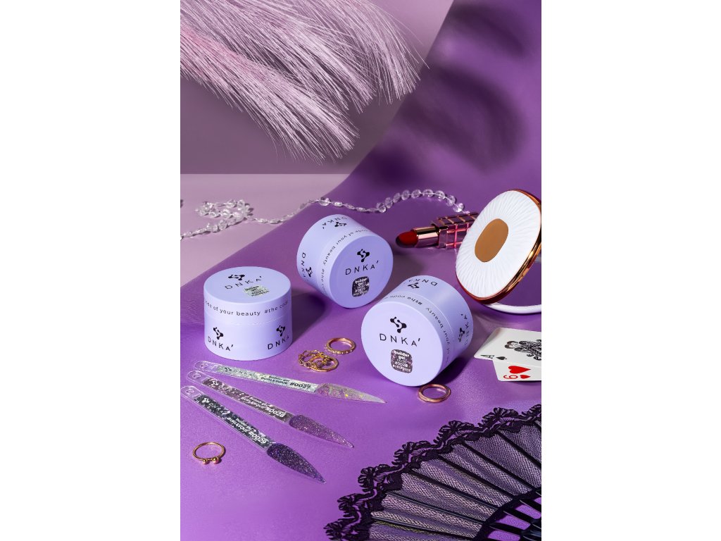 DNKa modelovací gel na nehty, poloprůhledný s tmavě fialovými třpytkami, je vhodný pro modelování a prodloužení nehtů na horní a dolní formy. V tenké vrstvě je elastický, a proto ho lze použít k posílení přírodních nehtů jakékoliv délky.