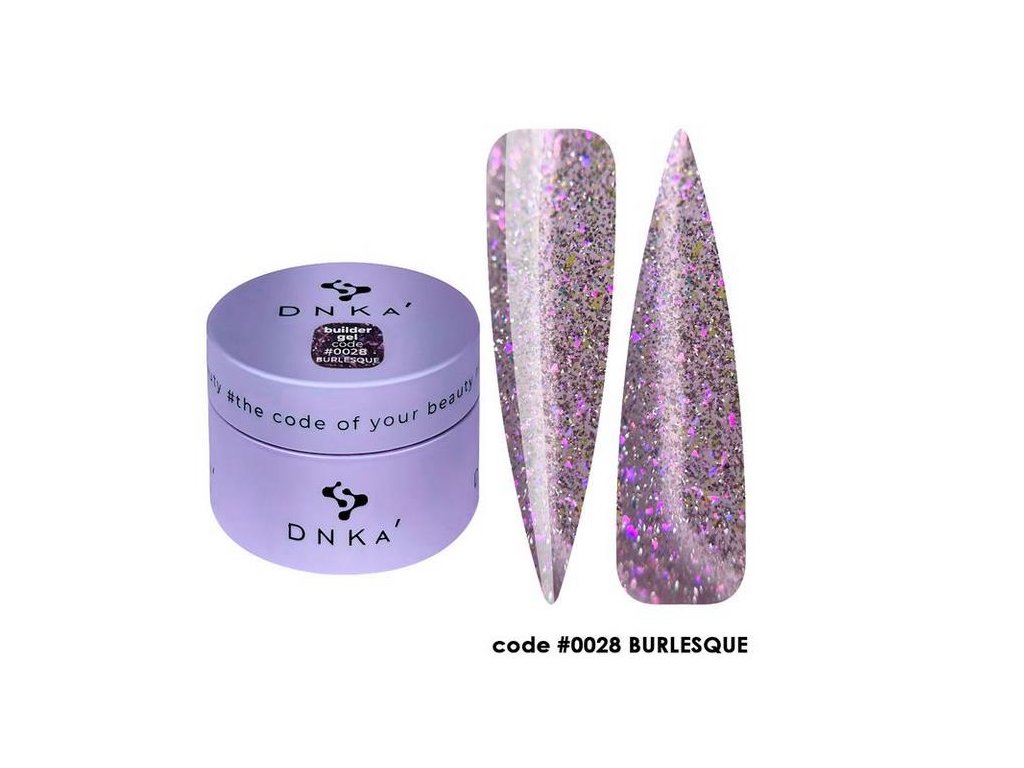 DNKa gel pro modelování nehtů Builder Gel Burlesque je profesionální materiál pro prodloužení a modelování nehtů. Je poloprůhledný s velkým množstvím světloodrazivých tmavě fialových třpytek.