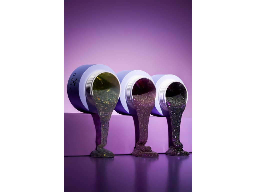 DNKa modelovací gel na nehty, poloprůhledný s tmavě fialovými třpytkami, je vhodný pro modelování a prodloužení nehtů na horní a dolní formy. V tenké vrstvě je elastický, a proto ho lze použít k posílení přírodních nehtů jakékoliv délky.
