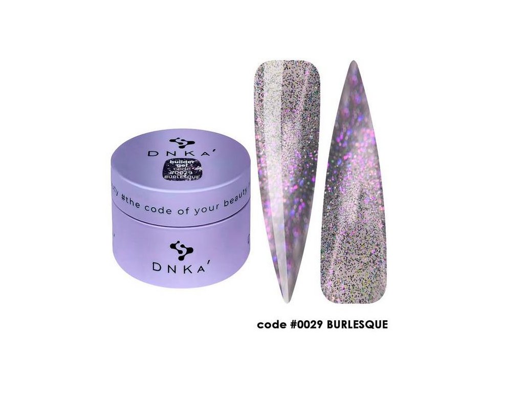 DNKa gel pro modelování nehtů Builder Gel Burlesque je profesionální materiál pro prodloužení a modelování nehtů. Je poloprůhledný s velkým množstvím světloodrazivých tmavě fialových třpytek.