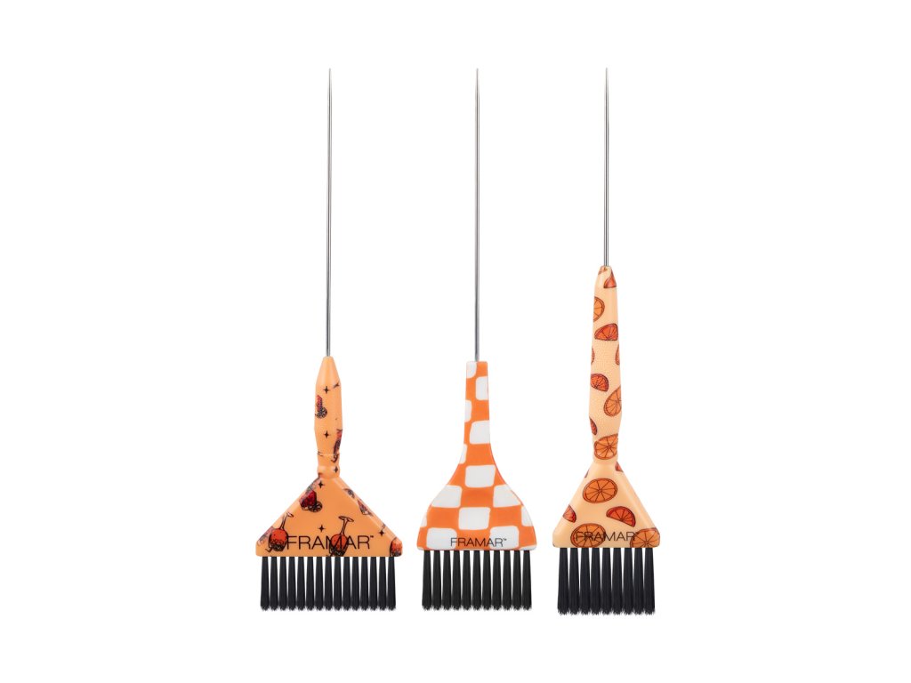 Oranžovo-citrónový štětec z limitované edice Framar Pin Tail Brush Set Puttin’ On The Spritz je profesionální nástroj, který kombinuje stylový design s vysokou funkčností. Štětec je vybaven kovovou pin-tail špičkou, která usnadňuje oddělování pramenů vlasů i při detailních technikách barvení.