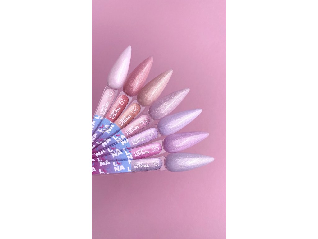 Light Acrygel №50 je tekutý akrygel určený pro zpevnění, vyrovnání a lehké prodloužení nehtů. Spojuje pevnost gelu a pružnost polygelu, má střední konzistenci a pohodlně se samovyrovnává.