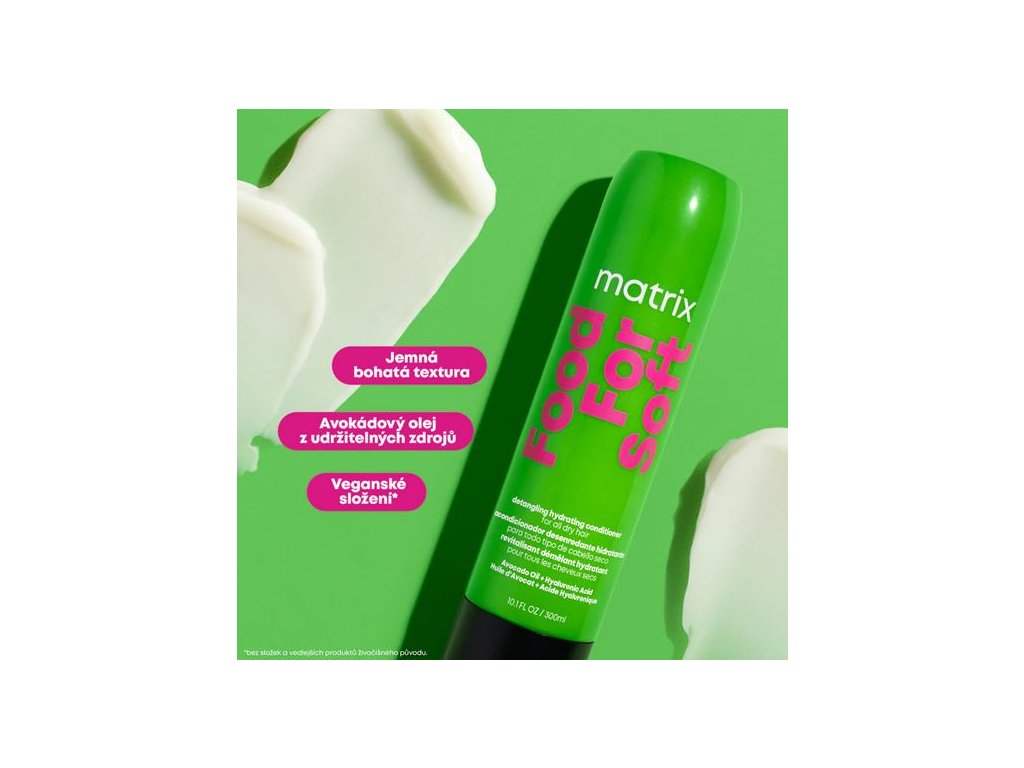 Hydratační kondicionér Matrix Food For Soft Detangling je nasycený avokádovým olejem a kyselinou hyaluronovou, která doplňuje hydrataci suchých a lámavých vlasů.