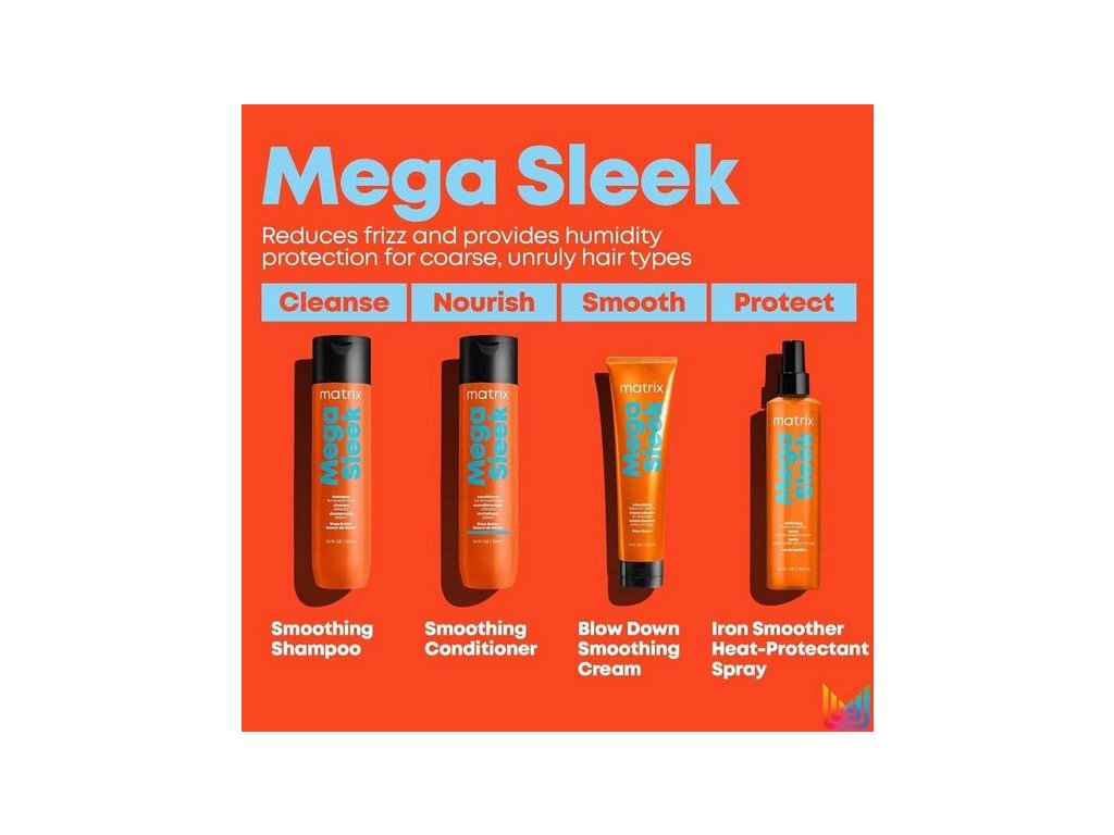 Nepoddajné, zacuchané a krepaté vlasy? Matrix Mega Sleek Shampoo si s nimi hravě poradí. Díky obsahu bambuckého másla uhlazuje vlasová vlákna, dodává jim lesk a poddajnost a chrání je i ve vlhkém prostředí. Vlasy zanechá hladké, svěží a snadno upravitelné – už po prvním použití.